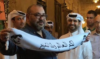 Et puis, mardi après-midi, une photo (ci-contre) montre le roi Mohammed VI tenant à bout de bras une écharpe avec cette inscription « Vous avez le monde, nous avons Tamim », qui a déclenché un démenti rapide de Yassir Znagui, conseiller du Roi, lequel a dit, dans une sortie inhabituelle pour un conseiller royal auprès d’un média marocain (Le360 en l’occurrence) que : « On est étonné par cette image, car il s’agit d’une image et non pas d’une photographie. C'est un grotesque montage! J’ai été présent à