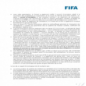 Fatma Samoura continuant à mettre à nu le système FIFA laisse entendre que « la diffusion tardive du ‘’Scoring System’’ ne peut être justifiée par le simple fait qu’il ait été communiqué ‘’dès que possible ‘’ aux candidats». Elle disculpe de fait les candidats par rapport aux manquements sur les nouveaux critères en affirmant que « les candidats ne pouvaient pas du reste soulever d’objections en décembre 2017 avant de prendre connaissance du contenu du ‘’Scoring System’’»