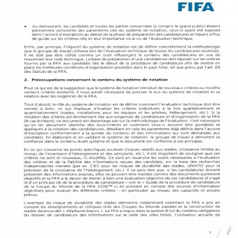 Fatma Samoura confirmant avoir tenu compte des préoccupations du Maroc, déclare dans sa réponse que « nous sommes toujours convaincus que le ‘’Scoring System’’ n’est pas conforme aux exigences du ‘’règlement intérieur’’.» Cette déclaration qui sonne comme un aveu du dérèglement du système FIFA disqualifie la Task Force qui, si elle est maintenue fera une mission de validation sur du faux. En principe cette mission serait d’aucune utilité car les règles établies dans les dossiers de soumission ne sont pas conformes aux exigences contenues dans les critères de validations. Même si les nord-américains ne sont pas tout-à-fait concérné parceque disposant déjà de ces insfrsatructures (coîncidence troublante). Néanmoins, ils devraient normalement soumissionner selon les mêmes grilles au Maroc.