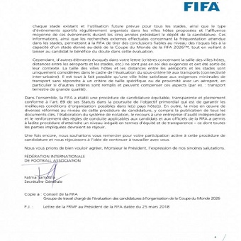 L’ire de Lekjaâ n'a pas fait réagir Infantino, mais la secrétaire générale de la FIFA Fatma Samoura est venu jouer les porteuse-d ’eau (comme à son habitude si Infantino est coincé). Dans sa lettre Mme samoura a tenté de minimiser le rôle de Gianni Infantino dans cette affaire en disant que « le président de la FIFA n’est pas partie prenante au processus d’attribution, (…) malgré le fait qu’il préside le Conseil de la FIFA et n’y possède qu’une voix... ». Mais l’oubli de madame Samoura est que la lettre de Lekjaâ est adressée à Infantino pas à une quelconque structure de la FIFA.