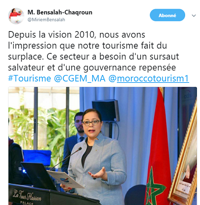 Faisant une analyse froide, la patronne de la CGEM laisse entendre que "Depuis la vision 2010, nous avons l'impression que notre tourisme fait du surplace". Ensuite, elle souligne que "Ce secteur a besoin d'un sursaut salvateur et d'une gouvernance repensée", a-t-elle fait entendre.
