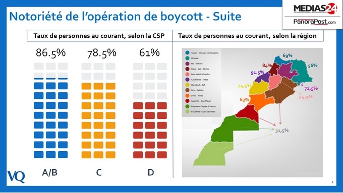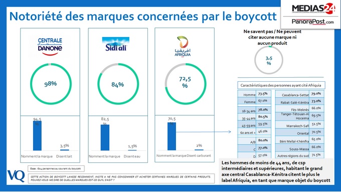 Dans le détail, pour les deux marques alimentaires Centrale Danone et Sidi Ali, les femmes sont à la manœuvre, d’une manière assez nette, alors que pour les carburants, femmes et hommes sont à égalité, avec 17,5% pour chacun des sexes. Le boycott est toujours le fait des jeunes de 18 à 44 ans (72,5% et 65,5% pour Danone et Sidi Ali, et 43,5% pour Afriquia), et des CSP AB (67%, 65% et 46%). La catégorie D a suivi le boycott de Danone à 25%, de Sidi Ali à 22,5% et d’Afriquia à 10%...