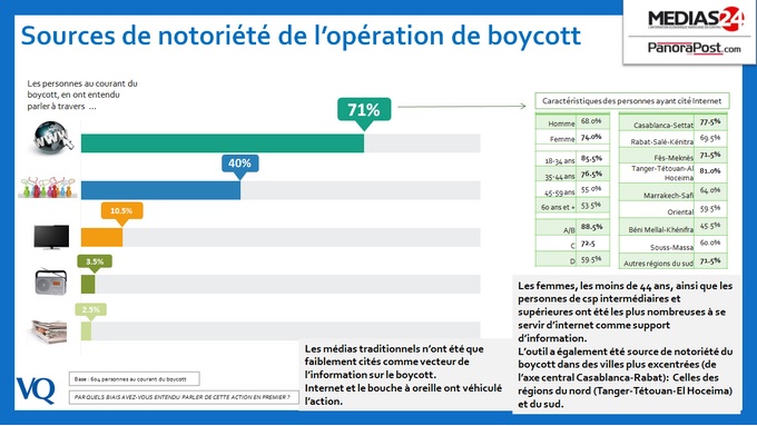 Mais d’où est parti et comment s’est propagé le mouvement de boycott ? Par le web d’abord, avant d’être prolongé dans les discussions directes, le bouche à oreille. Ainsi, 71% des gens interrogés ont répondu avoir appris l’existence de cette campagne par internet, et 40% en ont « entendu parler ». Il est assez intéressant de relever que les médias digitaux et audiovisuels n’ont pas porté la campagne.