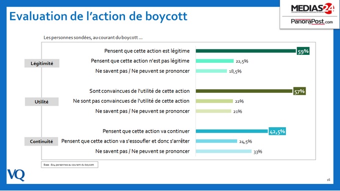 En revanche, les sondés pensant que les buts ont été déviés sont à près de 70% à estimer que la tournure politique a pris le dessus, visant certaines personnalités, et 23% affirment que la tournure prise par les événements est incomprise. Ce sont donc plus de 90% à assurer que le boycott est devenu politique.