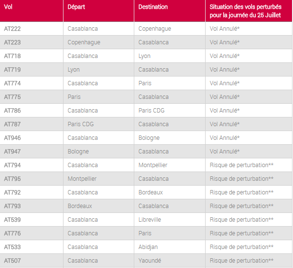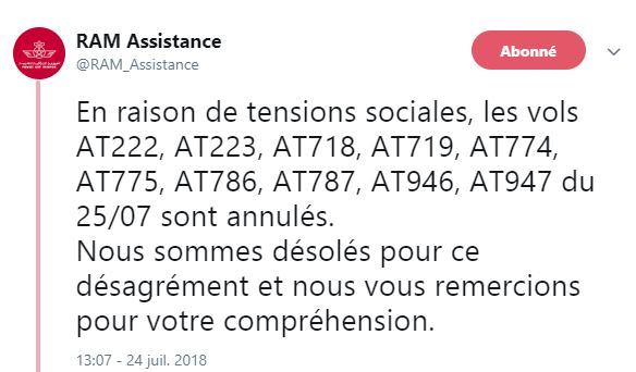 « En raison de tensions sociales, les vols AT222, AT223, AT718, AT719, AT774, AT775, AT786, AT787, AT946, AT947 du 25/07 sont annulés », a informé la compagnie sur son compte Twitter.