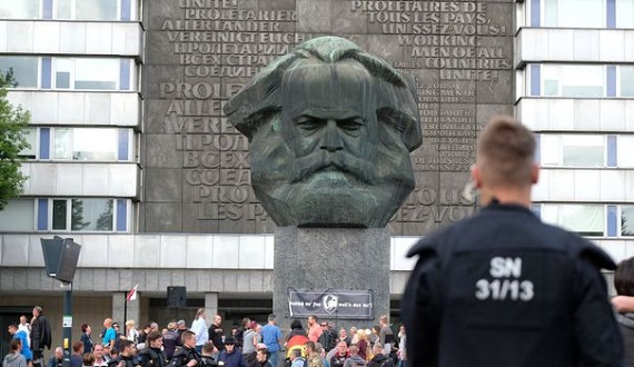 Dans cette ville de Saxe, où l'extrême droite et les néo-nazis sont fortement mis en place, les manifestants se sont retrouvés devant un grand buste de Karl-Marx (photo ci-contre)