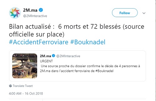 Sur Twitter, 2m actualise le bilan en annonçant qu'il avait atteint 6 morts et 72 blessés.