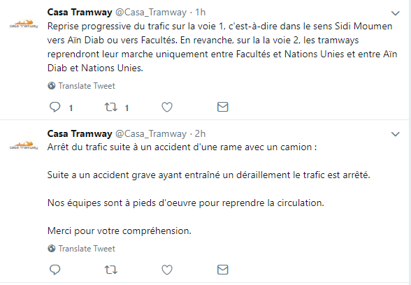 CasaTramway a dans un premier temps, sur Twitter annoncé que le trafic avait été bloqué à cause de l'accident, pour rectifier quelques temps après l'information et annoncer que le trafic est progressivement rétabli.