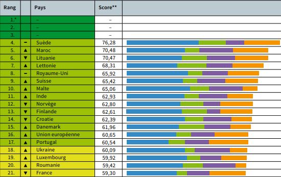 Dans l’indice de cette année, la Suède est en tête du classement, suivie par le Maroc et la Lituanie. Le groupe des pays à performance intermédiaire comprend des pays comme la France, le Mexique, l'Allemagne et la République tchèque. L'Indonésie, l'Autriche et la Nouvelle-Zélande se trouvent parmi les pays les moins performants, notés mauvais. L’Arabie saoudite, les ÉtatsUnis, la République islamique d’Iran, la République de Corée et le Taipei chinois se classent au dernier rang, avec des scores mauvais ou très mauvais dans presque toutes les catégories.
