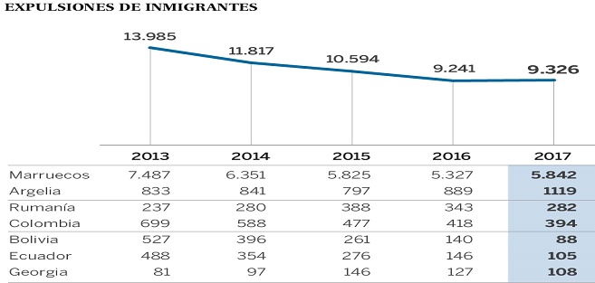 L'Espagne a expulsé ou renvoyé dans leur pays d'origine 54 963 immigrants entre 2013 et 2017, soit l'équivalent de 30 étrangers en moyenne par jour. Les Marocains représentent plus de la moitié de ces rapatriements forcés (30 832). Les données, extraites d'une réponse écrite du ministère de espagnol de l'Intérieur à la question de la sénatrice Maribel Mora (Unidos Podemos), révèlent que le nombre d'expulsions a diminué depuis quatre ans et a légèrement augmenté en 2017.