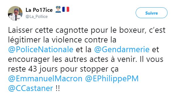 Sur leur compte Twitter, la police française a aussi réagi estimant que « laisser cette cagnotte pour le boxeur, c’est légitimer la violence contre la police nationale (…) ».