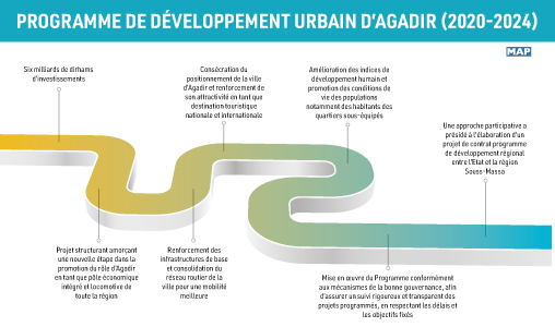 Le lancement de ce programme de développement urbain de la ville d’Agadir intervient après le discours du 6 novembre du roi Mohammed VI à l’occasion de la commémoration de la Marche verte. «La région de Souss-Massa doit devenir un pôle économique reliant les parties septentrionale et méridionale du Maroc, en opérant la jonction entre Tanger au Nord et Oujda à l’Est d’une part, et Nos provinces sahariennes d’autre part», avait souligné le souverain.