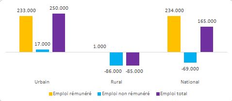 Selon le statut d'emploi, 234.000 postes d'emploi rémunéré ont été créés entre 2018 et 2019, 233.000 en milieu urbain et 1.000 en milieu rural, contre une création 173.000 entre 2017 et 2018. L'emploi non rémunéré, constitué de 98% d'aides familiales, a en revanche enregistré une baisse de 69.000 postes, résultant d'une création de 17.000 en zones urbaines et d'une perte de 86.000 en zones rurales, où elle était de 63.000 une année auparavant.