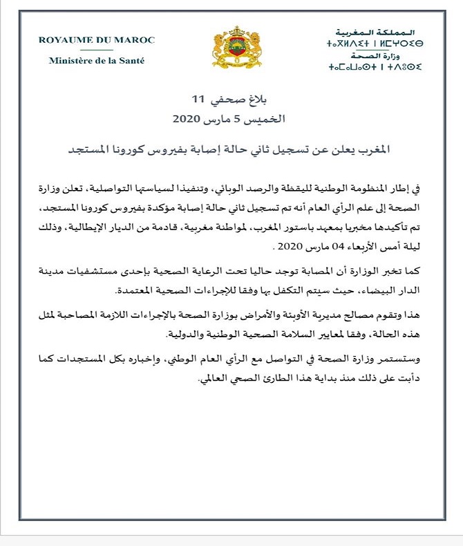 “Dans le cadre du dispositif de veille et de surveillance épidémiologique et en exécution de sa politique de communication, le ministère de la Santé annonce à l’opinion publique qu’un deuxième cas du nouveau coronavirus a été enregistré et confirmé au laboratoire de l’Institut Pasteur-Maroc d’une citoyenne marocaine en provenance d’Italie, et ce mercredi soir”, indique le ministère dans un communiqué.