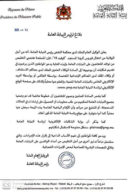 Le confinement des Marocains se poursuit et s’accélère pour lutter contre la propagation du coronavirus dans le royaume… La présidence du parquet vient d’annoncer de mesures pour éviter les engorgements habituels dans les tribunaux, pour les citoyen(ne)s désireux de déposer une plainte auprès des parquets des tribunaux de première instance et des cours d’appel. Les adresses et numéros sont affichés dans les tribunaux concernés, en plus du site ww.pmp.ma.