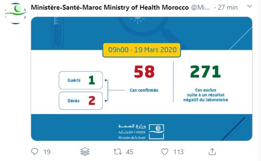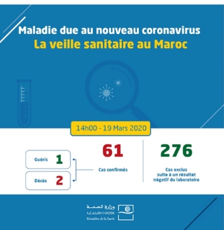 14H: Trois nouveaux cas viennent d'être annoncés par le ministère de la Santé portant le nombre de cas à 61 dans le territoire marocain, ce jeudi 19 mars. Ces 3 cas j'ajoutent aux 4 nouveaux déclarés ce matin.