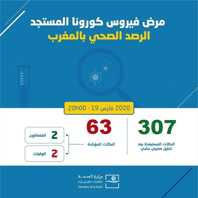 19H: Le ministère de l’intérieur vient d’annoncer la confirmation du 63 èm cas juste après avoir informé le 62e cas de coronavirus au Maroc.