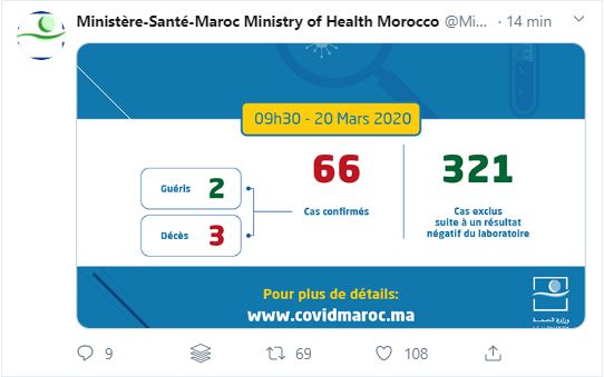 10H: Trois nouveaux cas portent à 66 le nombre des cas de contamination au coronavirus enregistrés ce vendredi matin au Maroc, indique le nouveau bilan publié sur le portail numérique que vient de lancer le ministère de la Santé pour permettre aux Marocains de suivre toute l'actualité sur le nouveau coronavirus (Covid-19).