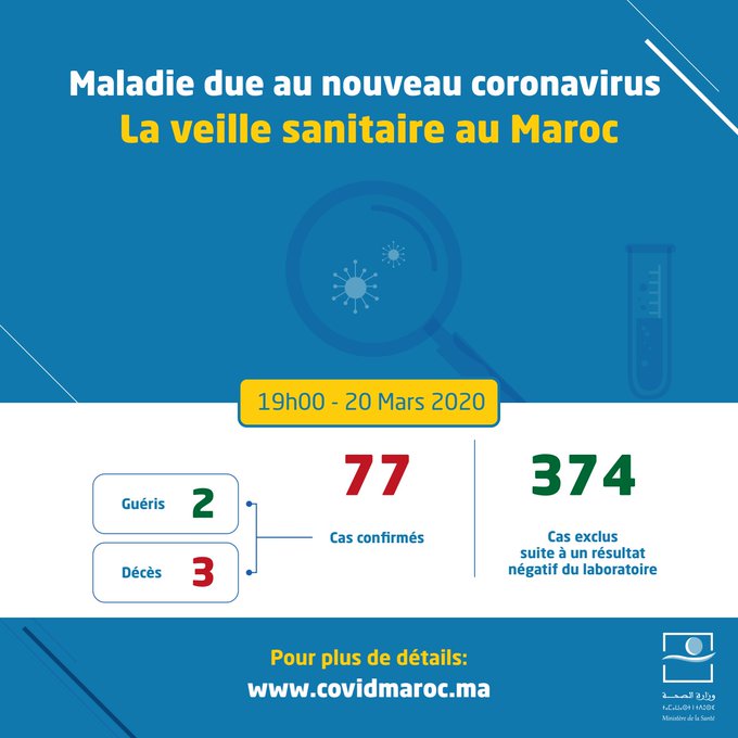 19H:3 nouveaux cas confirmés de coronavirus ont été détectés ce mercredi soir, portant le bilan national à 77 contaminations en comptant les onze nouveaux cas révélés ce matin, a fait savoir le ministère de la santé.