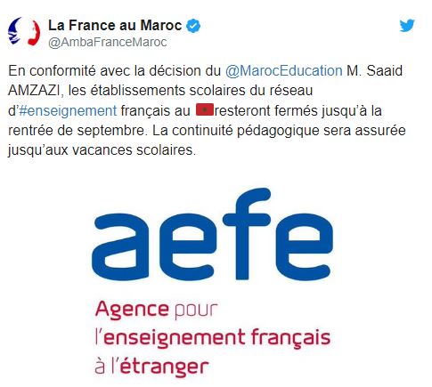 Les établissements scolaires français au Maroc emboitent le pas aux écoles marocaines. L’annone a été faite de France à Rabat qui un tweet informe que les établissements scolaires français au Maroc s’aligneront sur les écoles marocaines et n’ouvriront donc qu’en septembre..