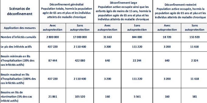 Une variante de ce scenario sans application des mesures d’autoprotection aboutirait après 100 jours, à un nombre d’infectés cumulés qui monterait à plus de 844.000 cas. Avec ces chiffres la capacité nationale de réanimation serait submergée en 50 jours. En 100 jours, le système sanitaire ne pourrait accepter en hospitalisation que 7% des infectés actifs.