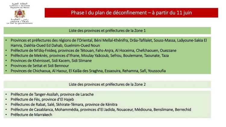 Les ministères de l’Intérieur et de la Santé ont rendu public dans la nuit du mardi 9 au mercredi 10 le détail spatial et réglementaire du plan de déconfinement qui sera appliqué dès jeudi 11 mai. Le Maroc est divisé en deux zones, et les mesures d’allègement des règles de confinement changent drastiquement d’une zone à l’autre, mais une évaluation et une mise à jour sera faite chaque semaine pour faire passer les préfectures mentionnées ci-dessous d’une zone à l’autre.