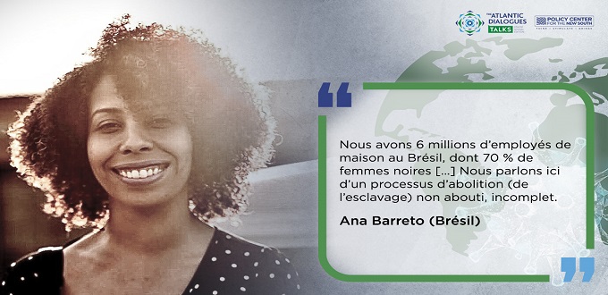 « Nous avons 6 millions d’employés de maison au Brésil, dont 70 % de femmes noires, a expliqué Ana Barreto Ils ont été déclarés travailleurs essentiels pendant le confinement, parce que les ménages riches et blancs ne peuvent pas faire leur vaisselle. Nous parlons ici d’un processus d’abolition (de l’esclavage) non abouti, incomplet. En évoquant cette histoire, qui n’est qu’un seul exemple au Brésil, on peut montrer comment le Coronavirus a entraîné des brutalités pour les employés de maison, dont l’un est mort après avoir été contaminé par ses employeurs, qui ne lui ont pas dit qu’ils étaient revenus positifs d’un voyage ».