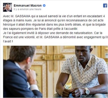 « C'est un acte exceptionnel, un acte d'héroïsme. J'ai souhaité qu'on puisse prendre une décision exceptionnelle pour vous », a dit le président à Mamoudou Gassama visiblement très ému. M. Macron a ajouté qu'il s'agissait d'une exception car en tant que migrant non demandeur d'asile, il n'aurait pas dû être régularisé.