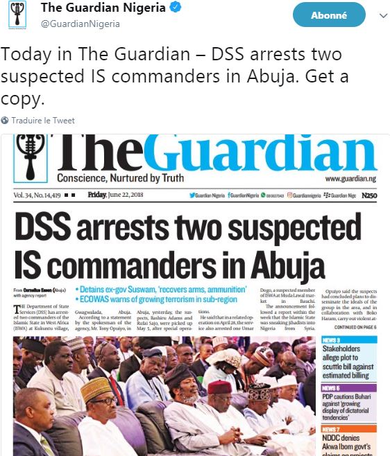 Deux commandants de l'ISWAP ont été arrêtés dans la capitale fédérale Abuja le 5 mai, tandis qu'un troisième individu est détenu depuis fin avril dans l'Etat de Bauchi (nord-est), a déclaré l'agence de renseignement du Nigeria (Department of State Services - DSS), dans un communiqué publié jeudi soir, rapporté par le journal Guardian (Photo)