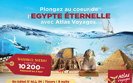 Pays des pharaons, du désert et des pyramides, l’Egypte est une destination phare de l’été 2018 chez Atlas voyage, l’agence met à la disposition de ses client 3 packages a des prix attractifs nous dévoilons à partir de 10200 Dhs TTC, un séjour en club 5 étoiles et