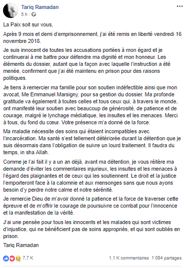 Sur une publication Facebook, Tariq Ramadan clame toujours son innocence et dit qu’il a été maintenu en prison pour « des raisons politiques ».