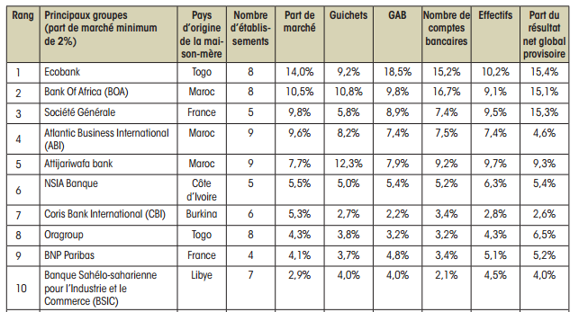 Ce classement est dominé par le groupe Ecobank, dont le siège est à Lomé, avec une part de marché de 14% en 2017. Il est le plus important groupe bancaire opérant dans l’UMOA et est présent dans tous les pays de l’Union. Il détient 9,2% des guichets, 18,5% des GAB, 15,2% des comptes de la clientèle. Et contribue à hauteur de 15,4% à la formation du résultat net global provisoire du système bancaire.