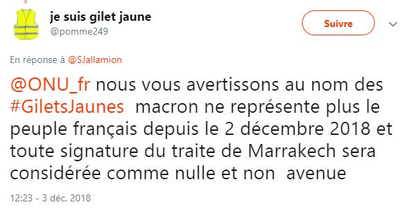 Dans les milieux d’extrême droite, le pacte de Marrakech est devenu le symbole de la « submersion migratoire » prétendument encouragée par le gouvernement, principalement Emmanuel Macron, ou encore de la « vente » de la France à l’ONU, qui prendrait le contrôle de la politique migratoire de notre pays.