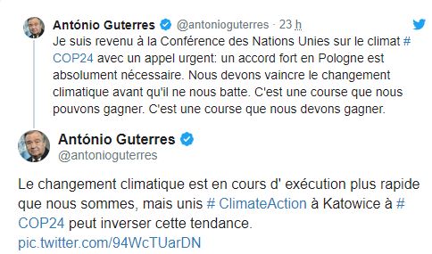 « Dans ma déclaration liminaire à cette conférence il y a une semaine, » a déclaré M. Guterres, « j'ai averti que le changement climatique se déroulait plus vite que nous et que Katowice devait - sans aucun doute, être un succès, en tant que plate-forme nécessaire pour inverser cette tendance. »
